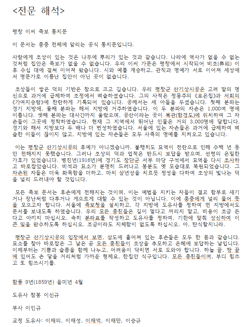 이 통지문은 평창 이씨 가문이 족보를 새로 편찬하면서 다음과 같은 내용을 담고 있습니다: